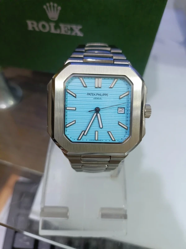 Discover timeless sophistication with the Patek Philippe Steel Elegance – Azure Dial Edition. Featuring a brushed stainless steel case and bracelet, this exquisite timepiece showcases a striking turquoise blue dial with fine horizontal lines and minimalist indices. Precision-crafted in Switzerland, it offers both luxury and reliability for the modern gentleman. The bold design, combined with the brand’s legendary craftsmanship, makes it a perfect companion for both formal and casual attire. Complete with a date display and sapphire crystal, this watch is a true statement of refined taste and distinction.